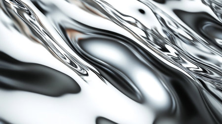This abstract background features a fluid metallic surface in chrome, creating a futuristic feel. Ideal for tech-themed designs and promotional materials, it showcases flowing silver textures