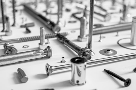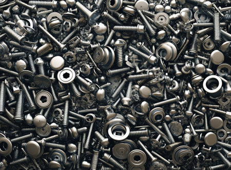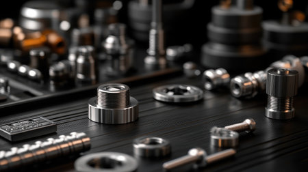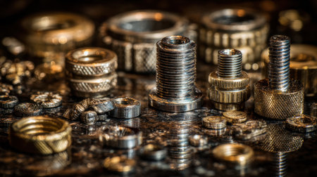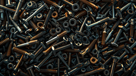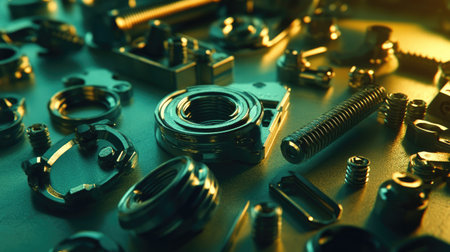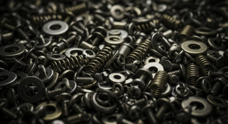 This image showcases an array of metal fasteners and components arranged artistically, featuring intricate textures and dynamic lighting perfect for industrial themes.