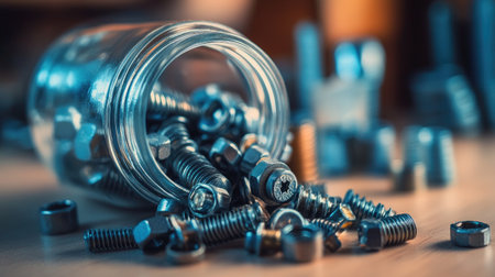 A collection of metallic screws and bolts spills from a glass jar onto a wooden surface, showcasing the texture and shine of various hardware components.