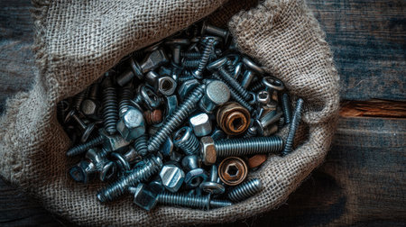 A close-up view of assorted metallic fasteners spilling from a rustic burlap sack, showcasing a mix of screws, bolts, and nuts against a weathered wooden surface.