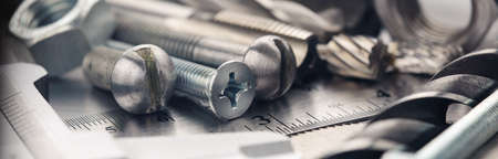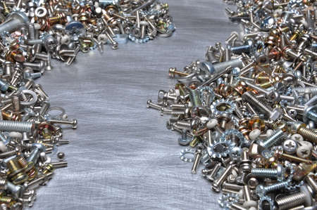nuts, bolts, screws, washers, bearings on a metal steel background.