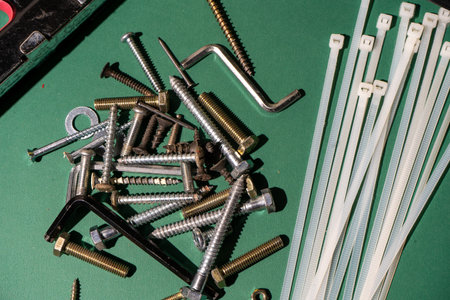 Assorted screws, nuts, bolts, nails, washers, an allen key, and cable ties lying on a green surface, creating a still life related to construction and diy projects