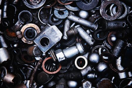 Pile of fasteners and screws close up. scrap metal. different metal parts. industrial background