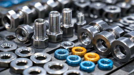 A stunning close-up image of various metal nuts and bolts displayed on a reflective surface, showcasing the intricate details and textures of industrial hardware components.
