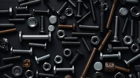 A visually striking assortment of various fasteners, screws, nuts, and other metal components arranged artfully on a dark background, perfect for industrial themes.