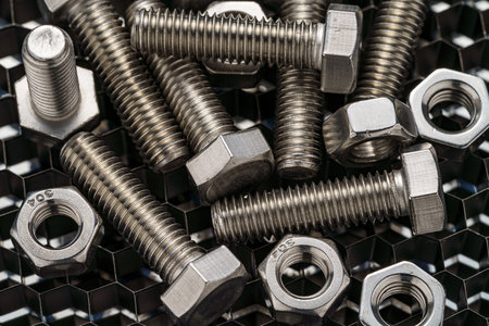 Close-up shiny nuts and bolts on metallic background