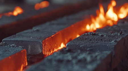 A close-up view of glowing hot metal blocks resting in a forge, surrounded by dynamic flames, highlighting the textures and energy of industrial processes.