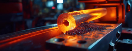 A glowing red steel bar rests on the metalworking shop floor, illuminating the surroundings with its intense heat amidst a backdrop of activity and craftsmanship.