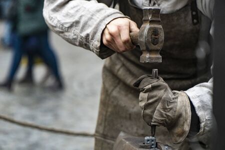 blacksmith is forging a souvenir horseshoe on a city street fair