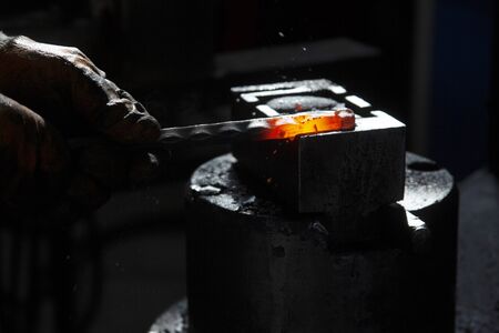 Blacksmith manually forging the molten metal on the anvil with spark fireworks