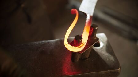 Forging an iron handmade product in a craft forge workshop