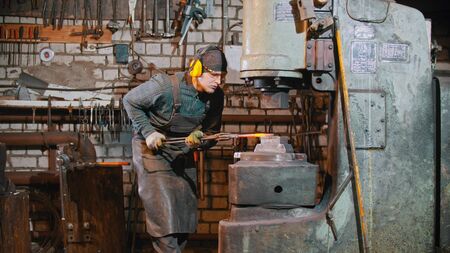 Forging industry - a man blacksmith putting the hot piece of metal under the pressure of big machine