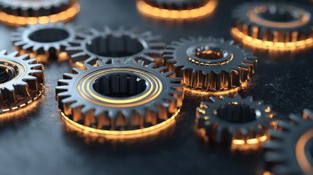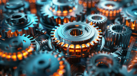 A collection of metallic gears with glowing edges, set against a dark surface, perfect for industrial, technology, or engineering concepts and projects.