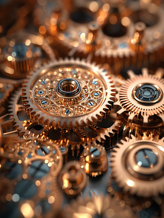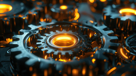 Intricate mechanical gears and clockwork components are displayed shining metallic surfaces and glowing highlights exemplifying futuristic engineering artistry and design.