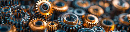 A detailed close-up image featuring an assortment of metallic gears in gold, bronze, and silver finishes. Ideal for industrial themes.