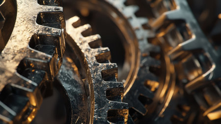 Metal gears interlock and reflect warm light in a close-up view showcasing their intricate designs. This scene emphasizes the beauty of machinery in an industrial environment.