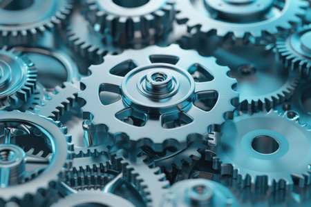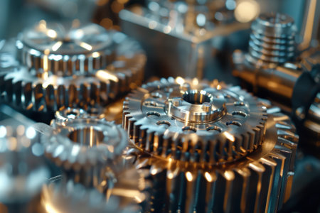 This close-up image showcases intricate metal gears arranged in a mechanical assembly, highlighting the shiny surfaces and precision of engineering craftsmanship.