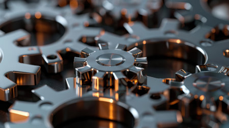 This image captures a close-up view of shiny metallic gears resting on a dark surface, featuring glowing edges that emphasize the themes of industry and engineering.