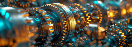 Detailed close-up of metallic gears, highlighting textures and colors, with vibrant lighting creating an industrial atmosphere, showcasing mechanical artistry and design