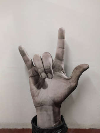Close up of human hand showing three fingers on black background with copy space. Hand on black with space for text. Sculpture of a hand.
