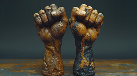 Two textured hands raised in solidarity showcase the beauty of diversity and strength.