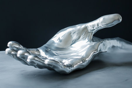 A hand with a fist made of silver and gold. The hand is in a black background. The hand is made of a shiny material and has a metallic look