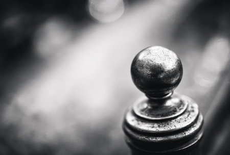 Close-up, black-and-white photo showing a weathered metal sphere on a decorative post, bokeh background