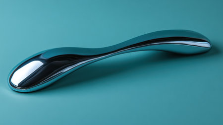 A sleek and modern metallic object showcasing smooth curves and a shiny surface on a vibrant turquoise background, perfect for contemporary design themes.
