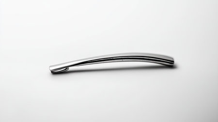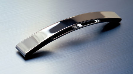 This image showcases a sleek, polished metal handle resting on a smooth brushed steel surface, ideal for modern design projects and interior applications.