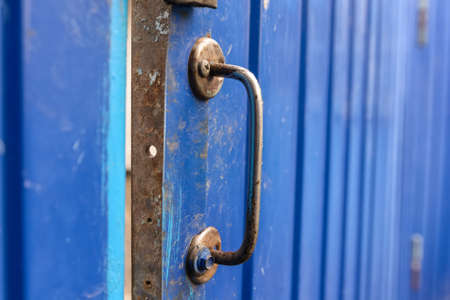 Rusty metal door handle on old rusty metal door, close up