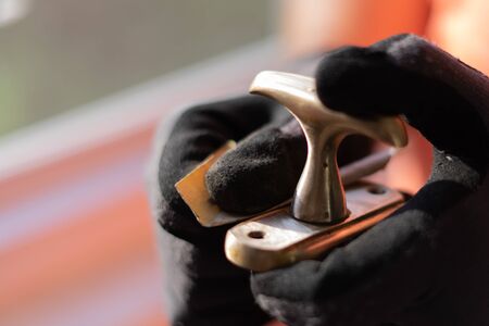 The master in black gloves recovers, polishes the brass copper window handle.Selective focus.