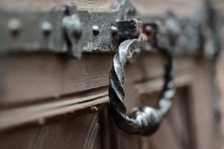 Ancient iron doorhandle on a wooden door as a closeup