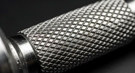 An extreme close-up, macro shot reveals the textured, knurled metal grip of a dumbbell or barbell handle. The intricate diamond pattern is designed for a secure grip, and the image conveys themes of strength, fitness, and weightlifting equipment.