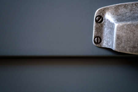 Stylish metal matte furniture handle on facade of gray kitchen cabinet, selective focus