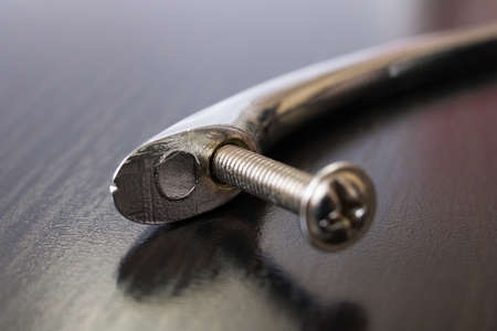 Door handle and bolt on a wooden table, repair
