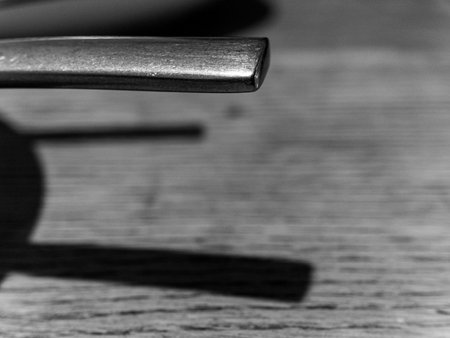 Two metal objects are on a wooden surface. One of the objects is bent. The other object is not bent