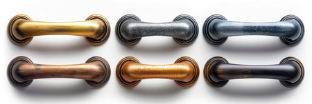 Elegant metallic cabinet handles in bronze and black. Curved design handlebars for drawers. Concept of modern kitchen hardware, luxury interior design, and refined home decor.
