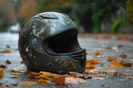 Dirty motorcycle helmet rests among fallen leaves on a rainy street, water droplets evident