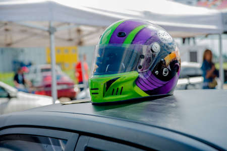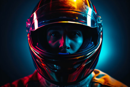 Close-up of man in helmet, concentrated and motivated racer over blurred background. Winner, champion. Concept of motor sport, racing, competition