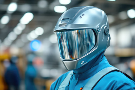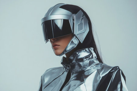 Woman wearing a sleek silver helmet with dark visor and metallic jacket, embodying future fashion and technology