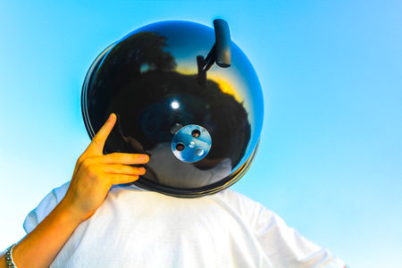 Man with grill hood as mask in Speckenbütteler Park Lehe Bremerhaven Bremen Germany.