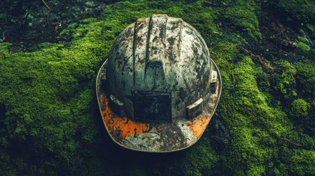 A weathered construction helmet rests on a lush patch of moss, showcasing the blend of industrial equipment with the beauty of nature.