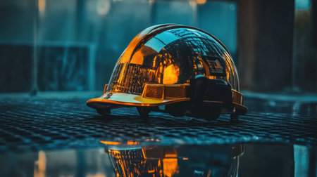 A reflective construction helmet rests on a gritty surface, showcasing detailed reflections of an industrial atmosphere during sunset, capturing safety and reliability.