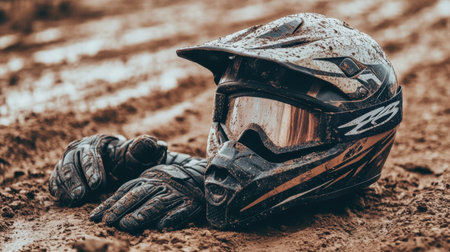 A striking close-up of a muddy dirt bike racing helmet and gloves resting on a rugged off-road trail, capturing the essence of adventure and thrill.