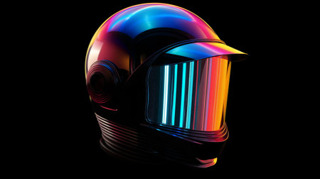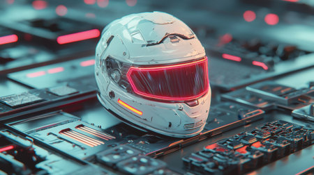 This image features a futuristic helmet with neon lights set against a high-tech background, showcasing sleek design and innovative aesthetics. Ideal for tech or sci-fi themes.