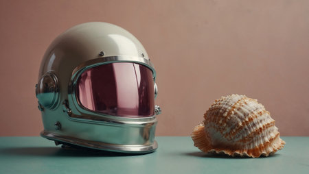 Old space helmet and seashell on pastel background. Minimal abstract evolution and humanity progress concept. Journey from ocean to space idea. Copy space.