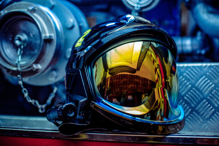 A close-up image of a firefighter helmet resting on the ground. The helmet features a red and white emblem with the number 18 prominently displayed. The helmet is equipped with a visor and various attachments, indicating readiness for duty. The background includes a blurred fire truck and other firefighting equipment, suggesting a scene of preparedness and readiness for emergency response.