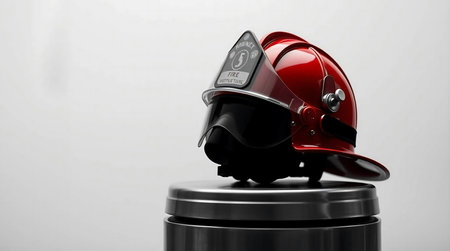 Symbolizing bravery and safety, a red fire fighter helmet stands ready for action. Perfect for conveying protection, emergency response, and heroic service.