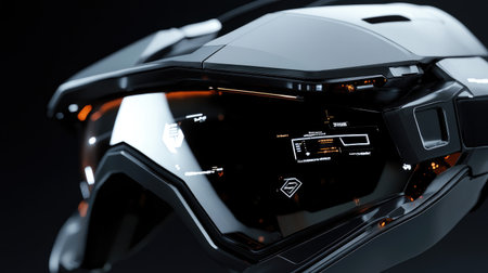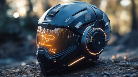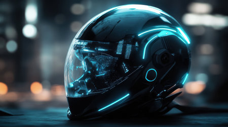This helmet showcases advanced technology with augmented reality interfaces and integrated sensors, illuminated with glowing edges, representing future innovations in wearable tech.