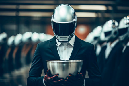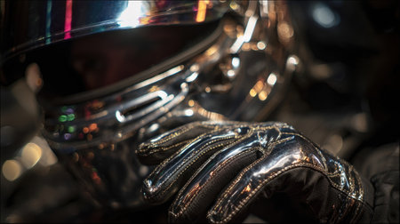 Chrome helmet reflects adventure in futuristic motorcycle racing industry exploration generated by artificial intelligence